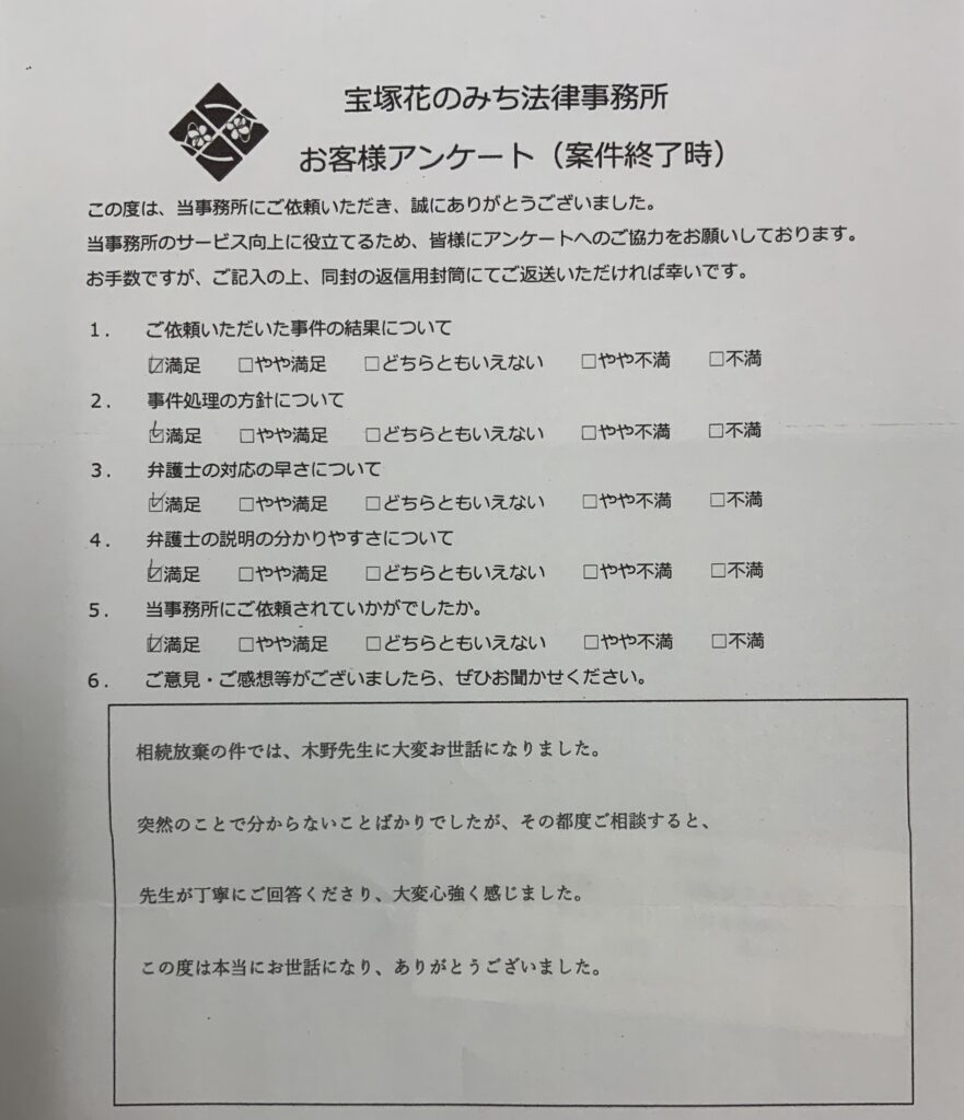 この度はとても複雑な相続放棄の案件依頼に対応して頂き本当にありがとうございました。 家の事情により人生で初めて弁護士さんに相談するという事もありとても不安でいっぱいでしたが、無料相談の時に親身に聞いてくださって不安もやわらぎ、木野先生にお願いしようと思いました。 こちらの色々な質問にも丁寧に答えて頂きとても分かりやすい説明でした。 今後何かあったら一緒に戦いましょうと先生に言って頂いた言葉がとても心強く本当に救われた気持ちになりました。 今回の依頼を早期に解決して頂き本当にありがとうございました。